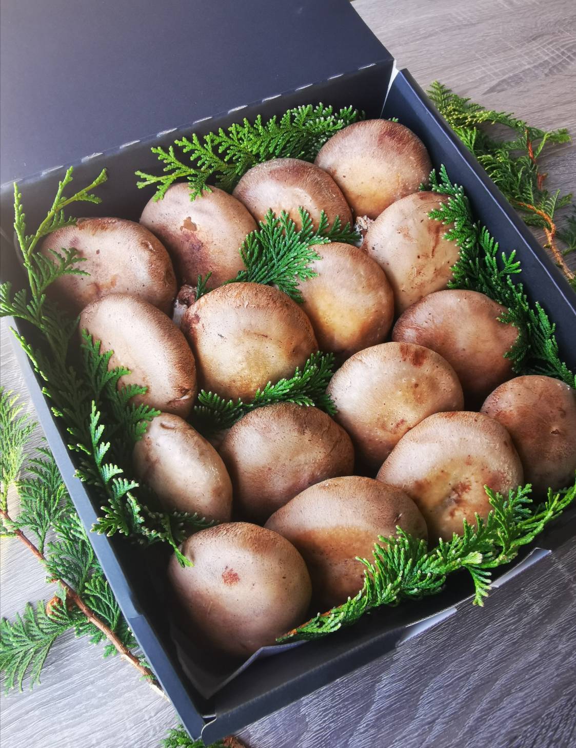 純国産の原料にこだわり抜いた生椎茸を、贈答用箱(檜葉付き)に1つずつ丁寧に手詰めしました。