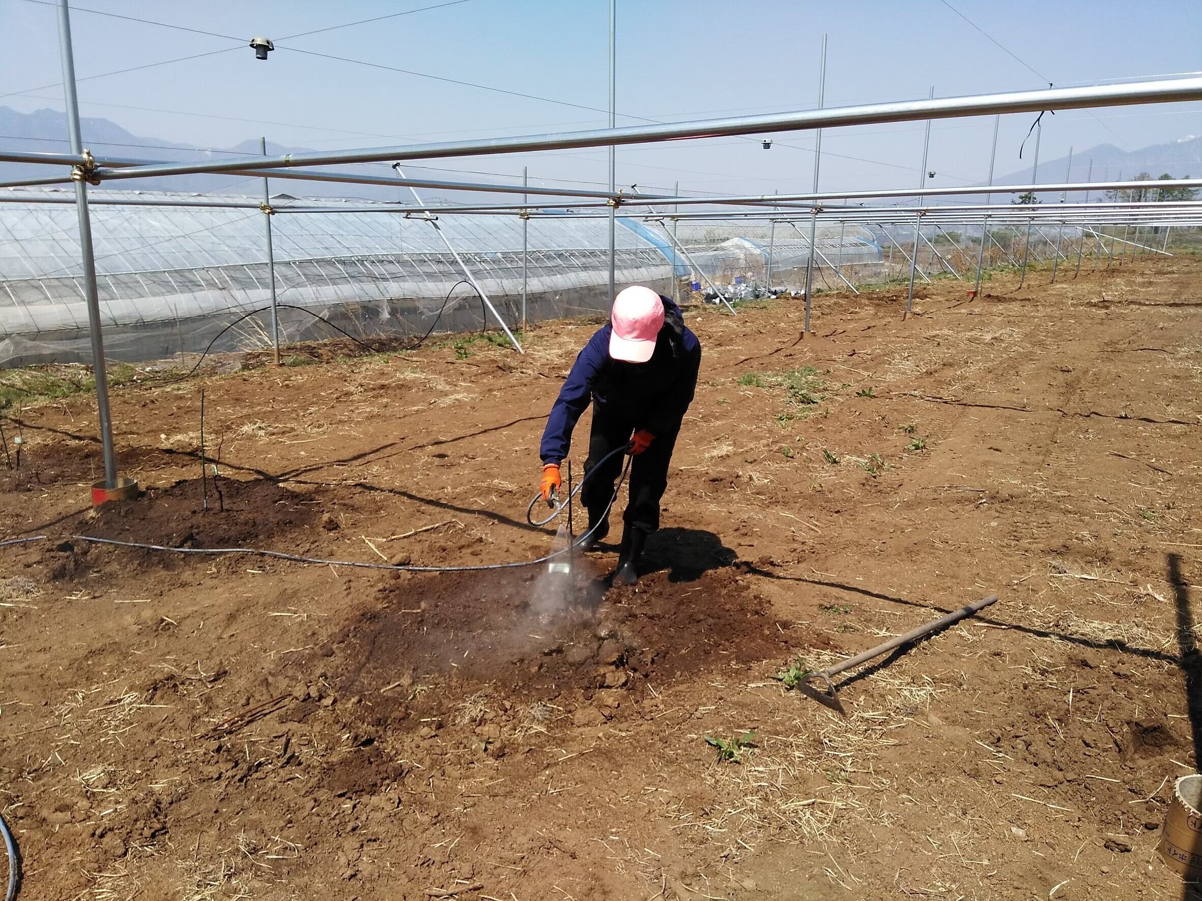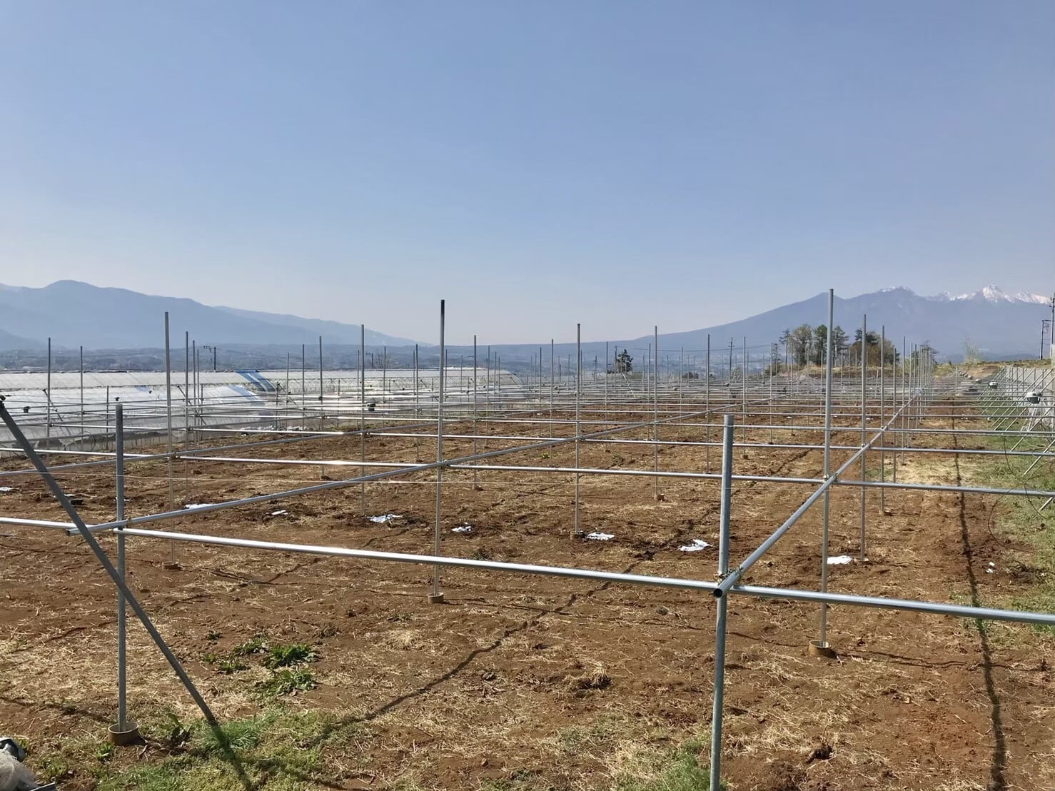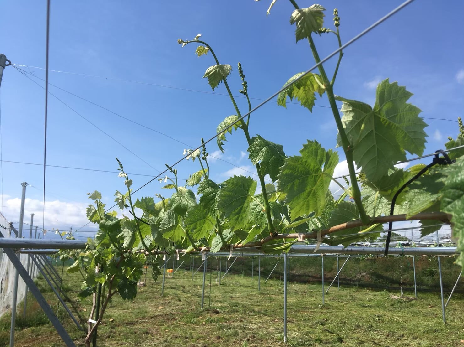 ぶどうの木が葉っぱを展開できるように金属のパイプで棚を作り、苗木を1つずつ丁寧に手作業で植えていきます。水分管理や枝の選定作業を行い、4年かけて棚全体に葉っぱを成長させます。